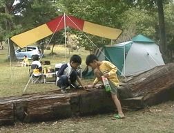 | 幼児にとってのキャンプはどんな意味があるのだろう。花に触れ,虫に触れ,木々に触れ,その五感を総動員しての体験は,幼児の情緒を豊かにしてくれることはこの上ないものであろう。そのことは,キャンプ前から想像できることであり,その通りの体験を子ども達は繰り返していると思う。 キャンプを続けながらふと感じたことは,子ども社会がそこにできることである。特にアスレチックはその姿が顕著にみられ,アスレチックの中で子ども達の遊びが発展し,それぞれが役割を持って動き出す。見ず知らずの子ども達が集まり,年上がリードし,ときには妥協しながら,作り上げていく小さな社会は,見ていてとても微笑ましい。昔の子ども達はどこでも繰り広げていただろう上下の社会である。 親からなかなか離れられない幼児にとって,アスレチックがサイト近くにあれば子どもの様子に大きな変化が見られることとなる。キャンプのテントは子ども達にとってすればまさしく家である。そこに親がどしんと構えてくれている安心感が,子ども達をいつもより積極的に子ども同士の交流を促してくれる。 我が家の息子はなかなか親離れができない。公園に行っても,親と一緒でなければなかなか思い切った遊びができなかった。が,キャンプに行くとみるみる友達を作っていく。自分から声をかけ,遊びに誘い,上手に主張し,相手の要求を聞き入れ,さまざまな遊びを繰り広げる。テントには必ず親がいるという安心感。キャンプ場という限られた閉鎖空間があるからこそ,息子は安心して,親の居場所を確かめながら,冒険ができるのだろう。 そんなことを考えながら妻に言った。 「このテントが息子の冒険を支える港だ。もし,これがテントだけだったら,ここまで息子は離れられないかもしれない。テントがあり,タープがあり,その下のテーブルを囲み,家族が根を据えて待っている。この安心感があるからこそ,息子はあんなに成長した姿を見せている。ねえ,タープ買ってよかったね。こんな効果があるなんて。」 妻もうんうんとうなずいた・・・・・ よし,これでタープが壊れても,もっといいのを買ってもらえそうだ。いや,次はたき火台が欲しい。「このテント近くにたき火があったら,夜も息子は安心して旅立つよ。」と言おうしたがさすがにやめといた。