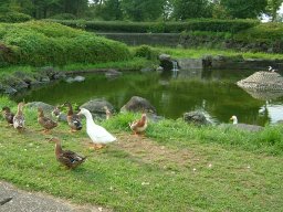 広場の横にアスレチック。池にはアヒルやカモがいて、子ども達には人気がある。