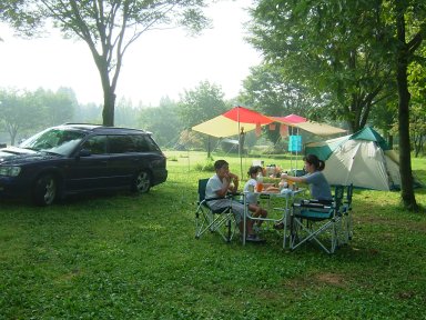 気持ちよい林の中をぐるりと車で走り、眺めのよい平らな場所をとり、ゆっくりとキャンプである。ここで気をつけなければいけないのは、平らだからと行って窪地を選ばないようにしたい。ここは阿蘇、夏は夕方や夜に雨が降って当たり前である。強い雨が降れば窪地はたちまち水たまりとなる。