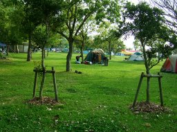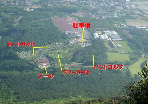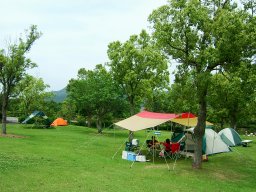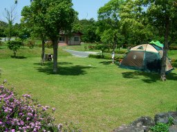 オートキャンプ場とフリーサイト(オープンキャンプ場)がある。フリーサイトは芝地の斜面である。平らなテント用の段がいくつか作ってある。 |