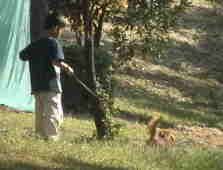| テント撤収時、福岡のMさん宅のワンちゃんを息子に託していただきました。Mさんのテントには息子がじゃかじゃかおじゃましたり、大変お世話になりました。でも、息子がこんなに親を離れて遊んだのは初めてで、このキャンプに来れて本当によかったと思う次第です。 |