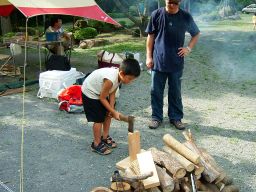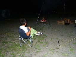 ジョン君のパパさんには,焚き火の薪割りから,火のくべ方などをやさしく教えていただき,息子は焚き火に夢中になった。火を扱うことがほとんどない今の子どもにとって,焚き火は夢中にさせる魔力を持っていた。息子は夜も朝も焚き火の番に夢中になる。