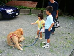 子ども達は動物が好きだ。ジョン君のそばで息子も娘も椅子を持っていって遊んでいる。ひもをひかせて散歩させてもらえるのがとてもうれしそうだった。