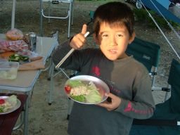 父と母は料理をがんばる。妻はうな寿司とイカの天ぷらを完成させ,なかなか好評だったようだ。アウトドアという既成観念がないのも料理の発想がおもしろいところか。
