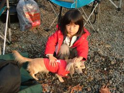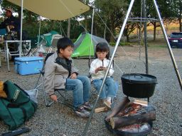 龍頭泉に向かう中,子ども達は熟睡モードに入る。管理棟で受付を済まし,サイトへ。子ども達はここが2回目ということもあって慣れている。母親をなかなか離れない娘だったが,今回はこつしんさんの愛犬ナナちゃんを預けていただき,ご機嫌で遊んでいた。息子は,焚き火にはまる。枯葉を集めて,随分木をくべないので,わけを聞くと,DOの中の料理が焦げないか心配だと言う。子どもなりにいろいろ考えている。