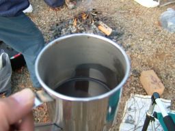 いつも圧力鍋で1合半しか炊かないので5合の勘がつかめず失敗。時間もないので,現地でもう一度飯盒だきをすることにした。