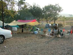 オートサイト(3000円)はグラウンドを使用したもの。一番奥のフリーサイトは,テント位置には芝生が正方形型に敷いてある。タープ類は砂利の上になる。多人数のキャンプには奥が向いている。