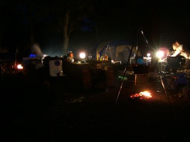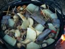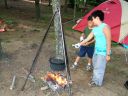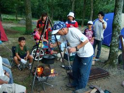 さてさて,テント設営が落ち着くと,それぞれ食事の準備である。ひとつひとつ,それぞれの家族で料理に気合いが入っている。何か作って分け合って,いつもながらのスタイルであるが,こんなに喰えるのかぁ。 |