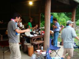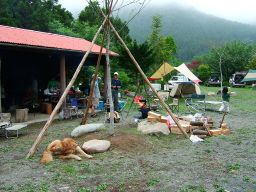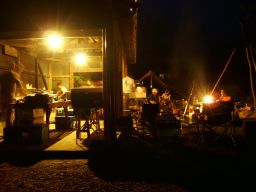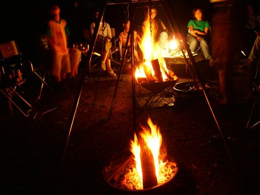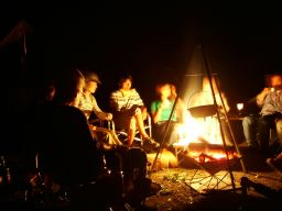 夜が深まると,自然と焚き火を囲んで楽しい話に花が咲いた。薪は今日もベッカムの母さんの極上薪。とにかく香りがとてもいい。ときとぎホタルが空を舞い,みんなは思わず「あっ,ホタル!」と叫び合う。 |