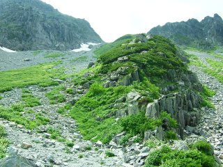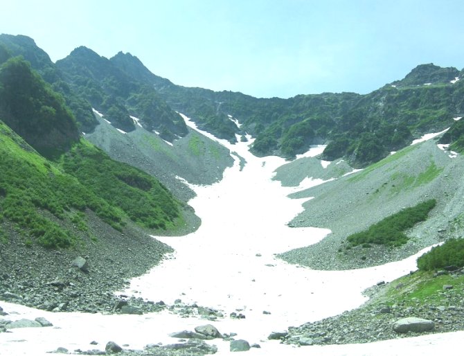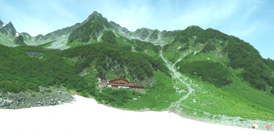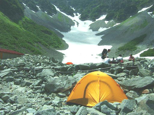 大きな石が累々と並ぶその先に涸沢が全貌を見せた。鋭く切り落ちたその谷合いの迫力にしばらく圧倒される。急な斜面の先にそそり立つ穂高連峰。斜面には雪渓がいたるところに残り、足下まで迫力ある流線型を描いて迫ってくる。白と緑と空の青のコントラストに立ち止まって見入ってしまう。ふと、我に返って、しばらく上がると、涸沢のテント場に着いた。カラフルなテントが立ち並ぶ、テント泊好きにはたまらない憧れのテント場である。石だらけの場所にどうやってテントを張るのか興味があったが、ひとつひとつの区画のように石が並べてあり、大きな石をどけて整地することで、寝床を作ることが可能となっていた。