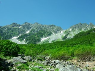 横尾橋を渡って本日の山登りがスタートした。朝の風がとても気持ちいい。梓川の音と小鳥の声にさわやかさをもらいながら、比較的なだらかな道を歩いていく。左前方には迫力ある屏風岩が姿を見せている。川を隔てた向かいの道は屏風岩を取り巻くように続き、屏風岩の向こうには北穂高岳が見え、山頂に立つ北穂高山荘が青空の中に映えている。