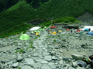テント場は石ごろごろとばかり思っていたが、立派な石畳の通路が中央に走っている。