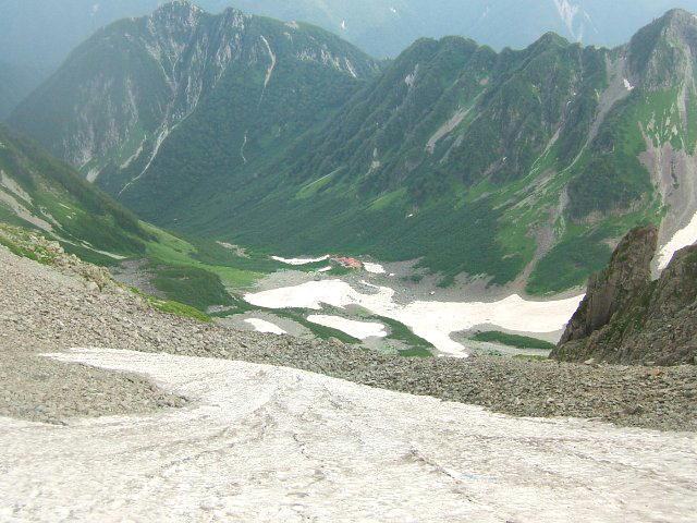 穂高岳山荘から、涸沢を見下ろす。結構登ってきたなあ。