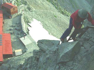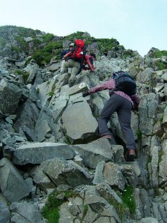 奥穂高岳に行くには、山荘の横の岩場を登ることとなる。下から見たり、登りながら下を見るとなかなかの高度感があるが、印にそって三点確保で登り、鎖とはしごをしっかり越えれば後は大丈夫である。しかし、ここは、山荘のテラスから休憩している人が登り降りをしている人をじぃ〜と見ているところが実は一番の緊張の原因だったりする。「そこ、ちがうよ。もうちょっと右の方!ゆっくりね。」などと下から声がかけられたりしていた。