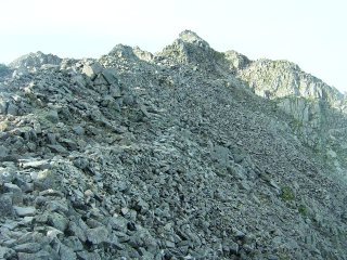 北穂高から涸沢岳に向かう登り。よく見ると、中間地点に人がいる。