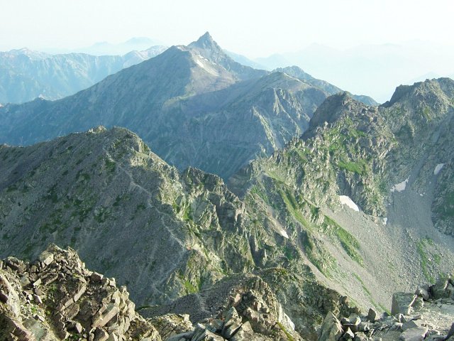 30分ほど歩くと奥穂高岳に着いた。南西方向に見えるジャンダルムの岩場が迫力満点である。また、前穂高に向かう吊尾根に目を奪われ、遠く槍ヶ岳の姿に感動し、梓川の蛇行に下界の世界を思ったりする。前穂側の広い場所に休憩し、またまた姿を見せてくれた槍ヶ岳をしばし感慨深く眺めてみた。
