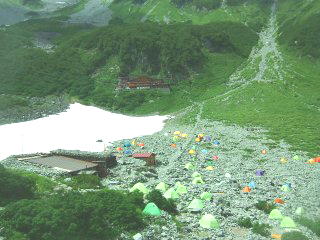 当初は、この後涸沢にテント泊をするつもりで、涸沢にテントを張っていたのだが、ババ平で茨城のご夫婦から進められた蝶ヶ岳の眺望が気になってしかたがない。ここまで晴れが続いたら、この山登りの総括に、素晴らしい眺望を見てみたい。蝶ヶ岳を往復し、明日までに松本まで出ようと考えると、今宵は横尾まで出ていた方が無難である。一度設営した涸沢のテントは家主に泊してもらうこともなく、一晩荷物を置かれただけで撤収の憂き目にあった。涸沢にテントを張ったという事実だけは写真に残ったのでまあいいか。