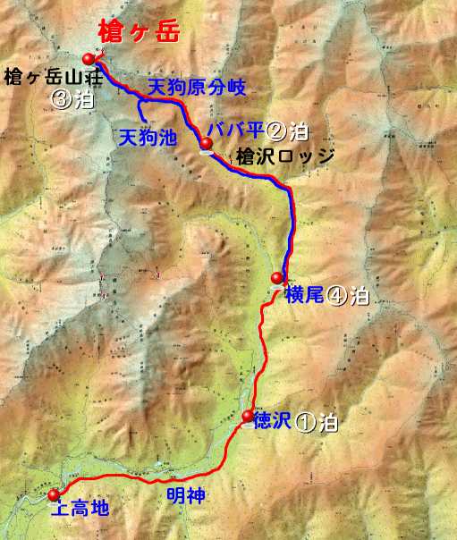 | 槍ヶ岳 上高地バスターミナル〜50分〜明神〜50分〜徳沢 (徳沢テント泊) 徳沢〜60分〜横尾〜60分〜一ノ俣〜30分〜槍沢ロッジ〜30分〜ババ平 (ババ平テント泊) ババ平〜80分〜天狗原分岐〜60分〜坊主岩小屋〜80分〜槍ヶ岳山荘〜10分(混んでいると30分かかる)〜槍ヶ岳〜10分〜槍ヶ岳山荘 (槍ノ肩テント泊) 槍ヶ岳山荘〜60分〜坊主岩小屋〜40分〜天狗原分岐〜40分〜天狗池〜40分〜天狗原分岐〜100分〜槍沢ロッジ〜100分〜横尾 (横尾テント泊) 概念図 (赤線:往路、青線:復路) |