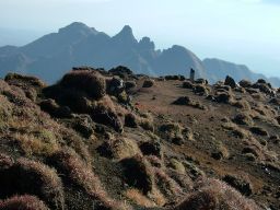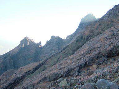 平日の朝,7時。誰もいないかと思いきや,もう登っている人が3人。見上げる山陰が美しい。朝の気温は2度。まだ日陰で寒い。体を暖めるように歩き出す。今日は仙酔尾根を登って,高岳,中岳を経てぐるりと一周してくる。