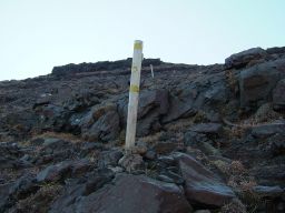 仙酔尾根は,急登が続く。こんなに眺めがずっといい尾根歩きは気持ちいい。ちょっと歩いては振り向き,ちょっと歩いては振り向く。自分が登っていくのが,眺めでわかる。石がごろごろとしているが,地面にしっかりついた石で,みかけよりは歩きやすかった。ただ,ルートどりはペンキの印を当てにしながら進む。また,棒が立ててあるので目安になる。まちがっても違うルートに入らないようにしたい。
