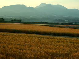 早朝出発。麦畑の向こうに雲仙の山々。 そして,途中通った田代原から,九千部岳とミヤマキリシマ。