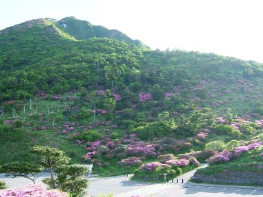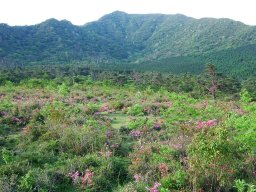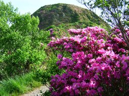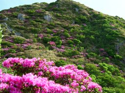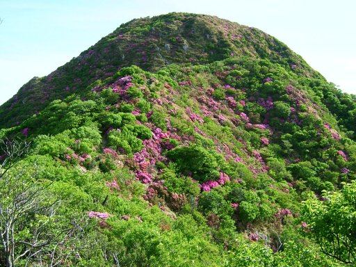 妙見神社を経て,国見岳へ。国見岳の山腹もミヤマキリシマでピンクに色づいていた。山の色がたくさんのピンクに包まれる姿は,実際は初めて見たが,圧倒する迫力がある。自然の演出の偉大さを感じる時間だった。