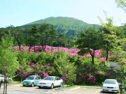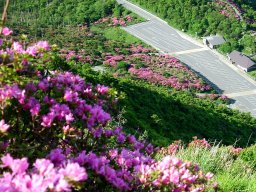 さあ,登山開始。いきなり工事中で,迂回路を歩く。しかし,この迂回路にはミヤマキリシマの群落の横を通り,この時期には返って好都合だ。段上の道を少しずつ進んで,仁田峠駐車場に到着。まだ有料道路のゲートは閉まっているので,静かなただずまい。妙見岳の山腹にはミヤマキリシマが咲いている。しかし,朝の光はまだ弱く,花の美しい色合いは十分出ていなかった。帰る頃にはまぶしい鮮やかな色を見せてくれそうだ。