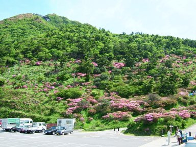 池の原駐車場に着くと,いやあミヤマキリシマがきれいだ。園地いっぱいに咲きほこる。妙見岳を見上げると山頂近くは少し赤く色づいている。