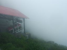仁田峠からは普賢岳はガスにまかれて見えない。妙見岳はまだガスはかかっていなかった。まず妙見岳を目指して登り始める。やっぱり暑い暑い。アブが結構身にまとわりつく。ロープウェイまで着いてちょっと小休止し,体を冷ました。まだ,ロープウェイは動いていない。ガスが下から上がってくる。