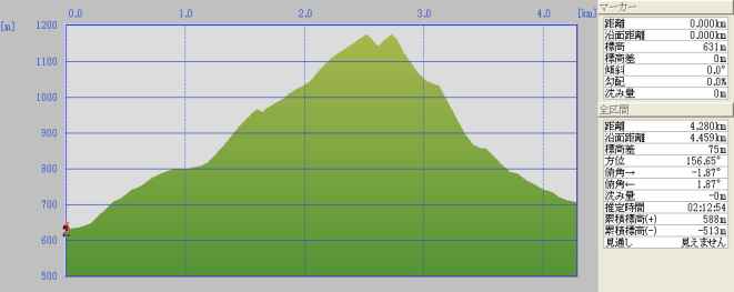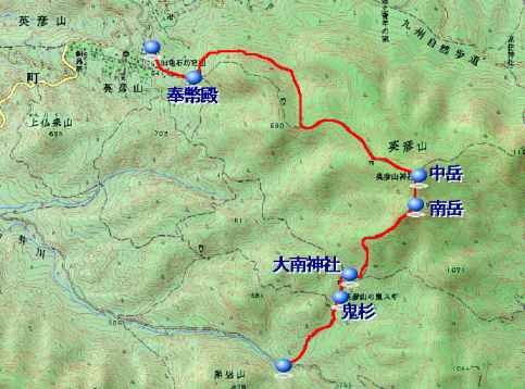 別府駐車場より上の有料駐車場〜15分〜奉幣殿〜45分(野鳥観察路)〜正面登山道合流地点〜30分〜中岳〜10分〜南岳〜60分〜大南神社〜10分〜鬼杉〜10分〜林道駐車地