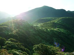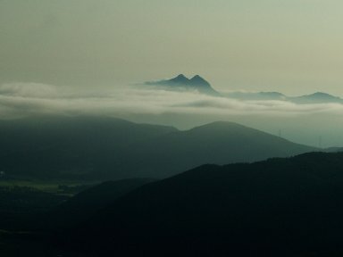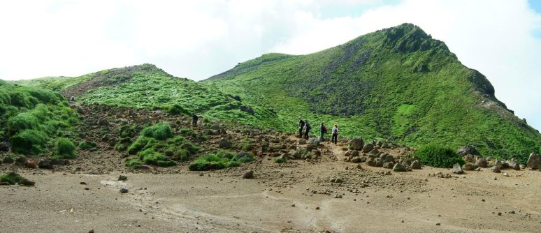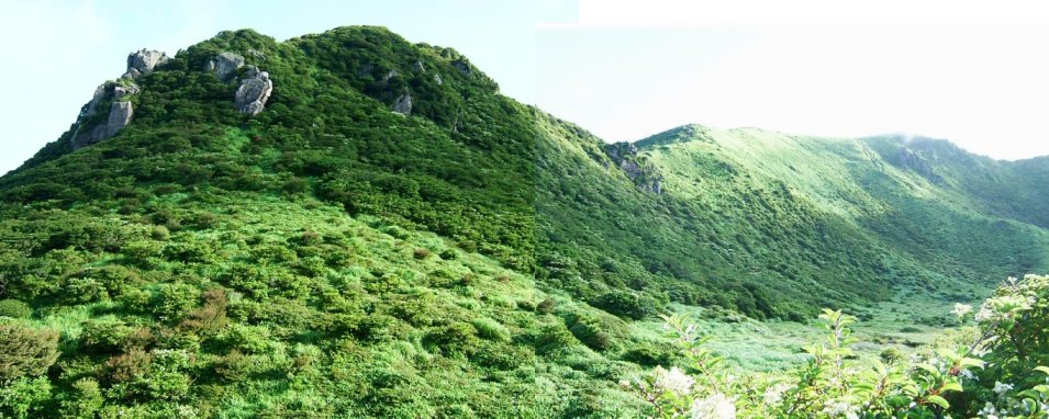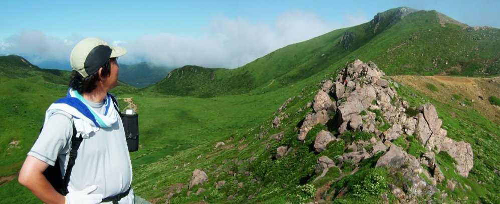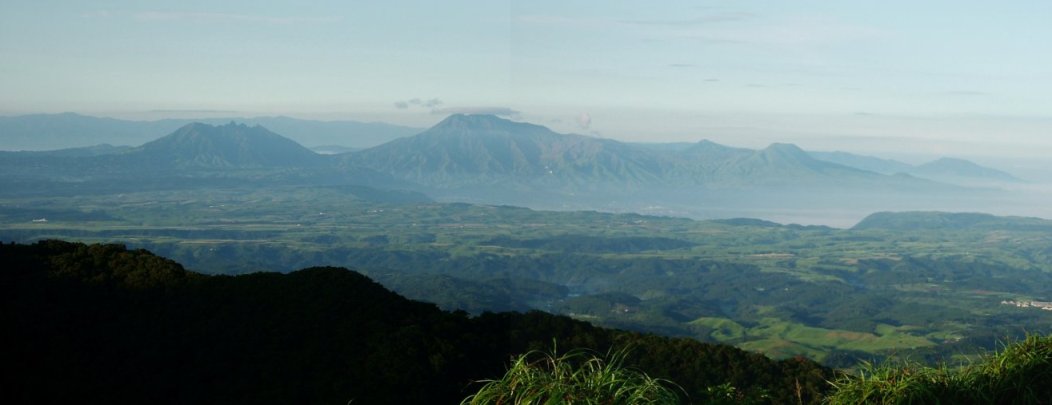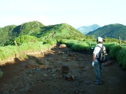 と声をかける。ついつい速くなるヒロ坊を諫めながら,とつとつと歩いて行った。沓掛山に着くと,気温17度。風が涼しい。夏であることを忘れそうになる。久住の早朝ならではの快適さである。沓掛山からは阿蘇の山並みがきれいに見える。今朝は夏だというのに,素晴らしい秋晴れのような視界である。わが長崎の雲仙や多良山系も確認することができた。