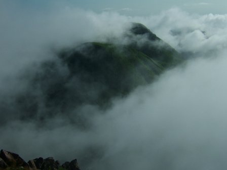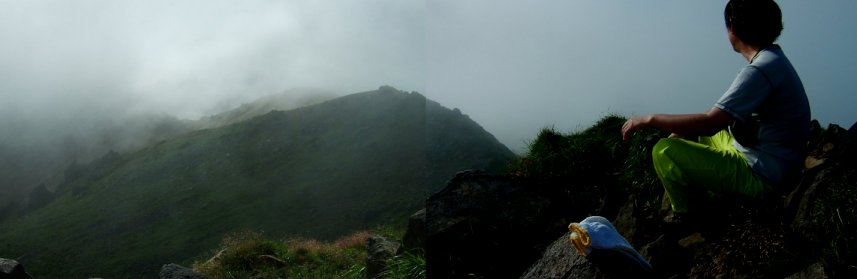 扇が鼻の分岐点まで来て,しばし休憩である。振り返る緑が陽を浴びてきらきらと輝く。ヒロ坊の疲れ具合を聞くと,全然大丈夫だいう。ならば,せっかくなので星生山を歩いて行こう。朝露でびしょびしょになるので,下だけレインスーツを履いて,星生山に取り付く。星生山までの尾根にかかると,北側から雲がせまってきた。あっという間にガスに包まれる。快晴の見晴らしから,ガスの中へと様相が一変する。高い山にいることを実感させられる自然の粋な演出である。ヒロ坊ほんとについとるなあお前。星生山までの道では,南側は快晴の見晴らしがある地上の楽園,北側がガスが渦巻く幻想的な世界である。現実と幻覚の狭間を歩いているような不思議な光景だった。
