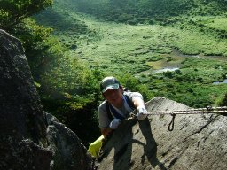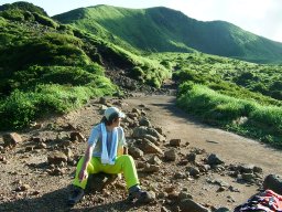 やがて,久住山山頂に着く。残念ながら南側の眺めはガスで望めないが,今歩いてきた北側の眺めは最高だ。今日は,この後下りるだけ。ゆっくり食事をして,いろいろな話をしながら,山頂のゆっくりとした時間を楽しんだ。結構元気に歩いたヒロ坊。しかし,やはり前半のおちゃめが過ぎて,最後はちょっと膝にきていたようだ。でも,笑いながら進む彼にワンゲル魂を垣間見た。