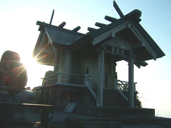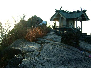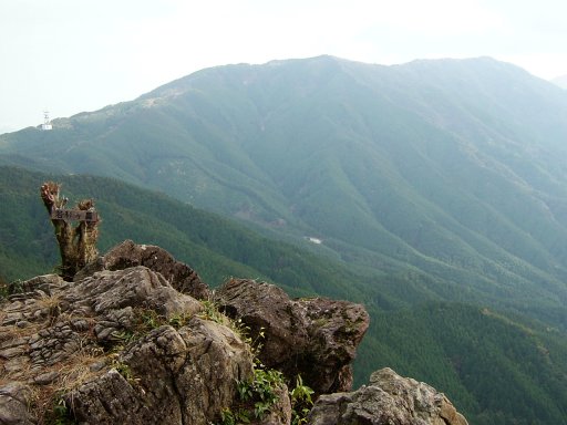 山頂には上宮がある。立派な建物だ。大きな岩でできた展望抜群の山頂である。岩に登っては,こっちを眺め,違う岩に登ってはあっちを眺める。このすてきな山頂に来たくて,たくさんの人が登ってくるのだなあと納得した。山頂からは,今日の終点,若杉山が遠くに見える。