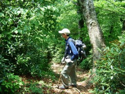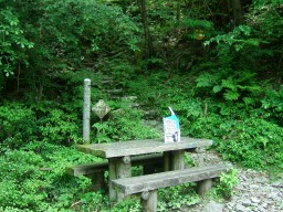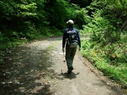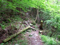 経読林道に出て,林道をしばらく歩き,ベンチのあるところから,笈吊峠をめざす。ここの道でも,コヨーテさんはぴったりついてくる。もう,F1レースのテール・テゥ・ノーズ状態だ。コヨーテさん,同じ年なのにすごい。私負けました。