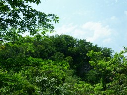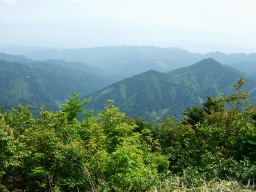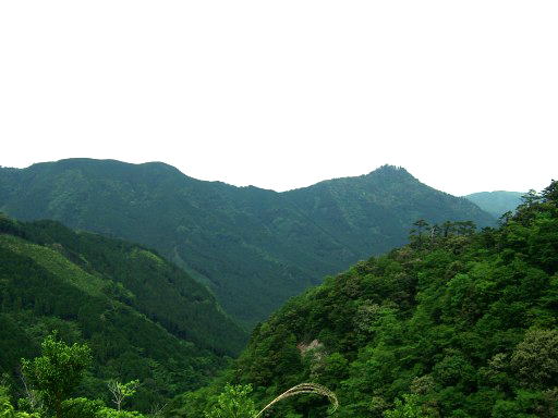 普通の登山道に戻ると,迷いようがない立派な道。しばらく舗装林道を歩き,気持ちのよい山道となる。緑がとても美しい道だ。そして,だんだん傾斜がきつくなり,展望が開ける。後で歩く求菩提山がよく見える。あの辺を肉まんさん達は歩いているのかなあと思うと,ちょっと焦ってきた。