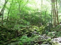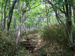 そして,求菩提山の縦走路へ。こちらの道は期待していなかったのだが,もう,ため息のブナ林や自然林の中を歩ける。そう,ドラマに出てくるような美しい道だ。CMで白い服の女性が音楽に合わせて駆けていくような道と言えばいいのだろうか。途中のピークの杉の宿と虎の宿にはベンチもあり,ゆっくり半日くらいくつろいでいたいような場所だった。