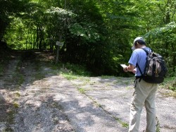 コヨーテさんを無理やり納得させ,左の林道を進む。しかし,あれ,もう舗装林道が消えたぞ。もうちょっと行ってみよう。あれ,道が崩れているぞ。これ,もともと道があったんじゃない。地図を見ながら,もうちょっと,もうちょっとと進む。人間戻ることが難しい。たまに黄色いテープもある。そして,いよいよ道がなくなった。ここで,コヨーテさんのGPSの登場。
