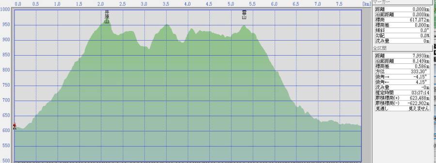 | 井原山〜雷山 渓流の里近く駐車場スペース〜5分〜渓流の里登山口〜40分〜鉄塔〜40分〜井原山〜80分〜944ピーク〜40分〜 雷山〜8分〜古場分岐〜40分〜布巻林道〜10分〜雷山林道出合〜15分〜渓流の里近く駐車スペース 断面図 |
