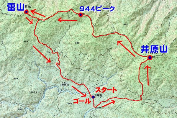 | 井原山 〜雷山 渓流の里近く駐車場スペース〜5分〜渓流の里登山口〜40分〜鉄塔〜40分〜井原山〜80分〜944ピーク〜40分〜 雷山〜8分〜古場分岐〜40分〜布巻林道〜10分〜雷山林道出合〜15分〜渓流の里近く駐車スペース 概念図 |