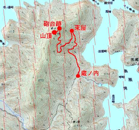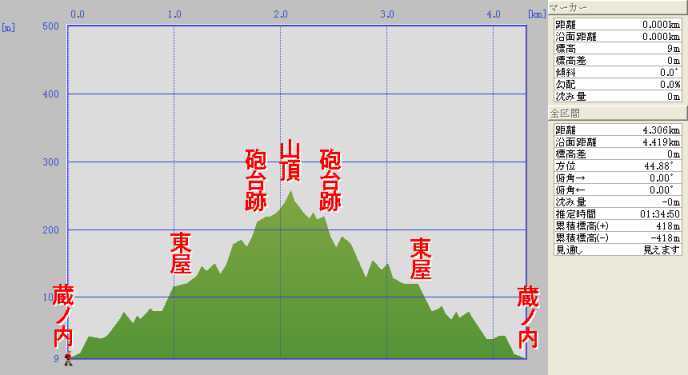 登山口(蔵ノ内)〜東屋〜砲台跡〜頂上〜砲台跡〜東屋〜登山口(蔵ノ内)