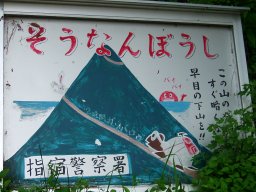 「この山の登山道はすぐ暗くなる。早めの下山を」