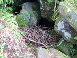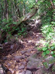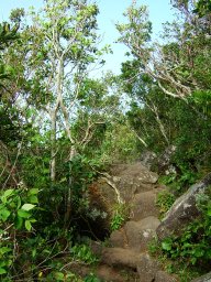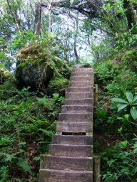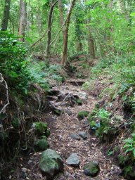 5合目を過ぎると,最初に視界が開ける場所に出た。長崎鼻方面が眼下に広がる。そして,その後はまた展望がきかない道やうっすらと海を眼下に感じながら進んでいく。途中,階段状の木組をわたったり,砂利状の歩きにくい道があったり,石がごろごろした道となったりと変化に富んだ道を歩いていく。