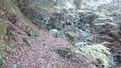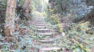 しばらく整備された道を歩くと、ほどなく林道に出る。林道を渡って、登山道に戻る。最初は木で整えられた階段状の道を登っていく。登山道の右下には、沢が続き、ずっと沢音を聞きながらの心地よい道が続く。沢を何回か渡って、急坂を登ると、ゆるやかな植林帯に入る。谷間を歩いてきた後、明るい陽が射す植林帯は趣が変わって楽しくなる。