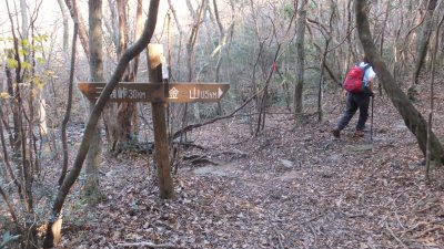 腰かけてくださいと言わんばかりの木の幹の横を通り、金山山頂と椎原峠の分岐へ。