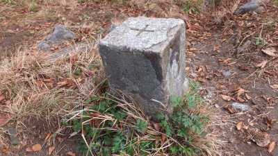 と説明して、三角点を見ると、角が欠けたためか補修してあった。こんな標識があるわけだ。