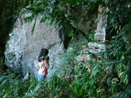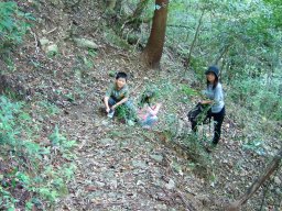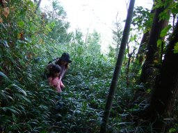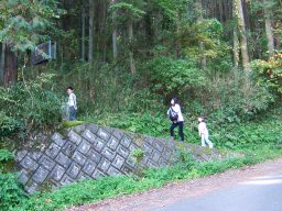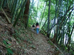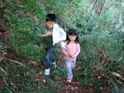 なんせ娘に無理はさせられないので,登りのみの山登りである。登山口で妻と子ども達を車から降ろし,3人は登山開始。私は頂上まで車を運び,登山道を逆走して,出会ったら登り返すことにした。思いの外,笹が茂っており,娘の背では苦労していた。途中,竹林あり,笹道あり,石仏ありと退屈させない道が続く。