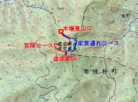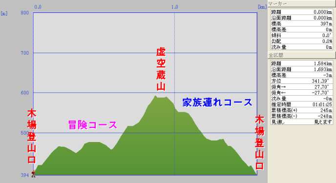 木場登山口〜コース分岐〜冒険コース〜〜頂上〜家族連れコース〜木場登山口