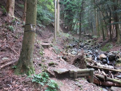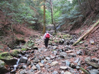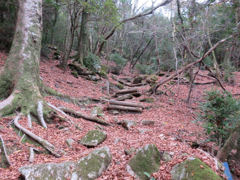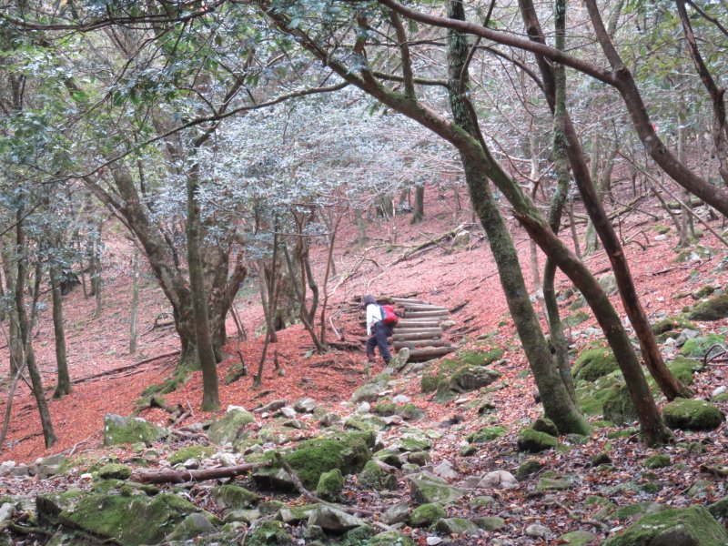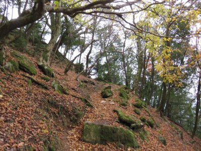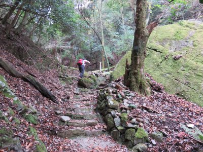 登山道を歩き出すと、案外急登である。登山道は以前の大雨の影響か、荒れ気味で本来とは違うであろう踏み跡をたどり歩いていく。本来は石畳が美しい道であったことが想像できる。