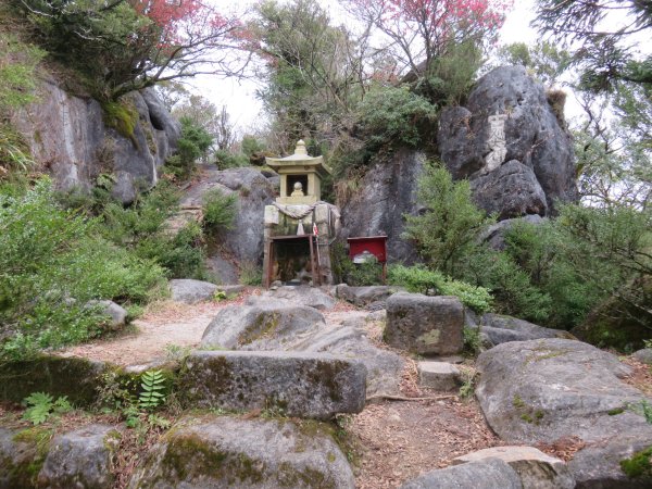 山頂に近くなると、秋色が増してきた。地面にはたくさんの落ち葉、黄色く色づいた葉が美しい。石像や石への刻印など、山岳宗教の山であることを感じながら山頂へ。